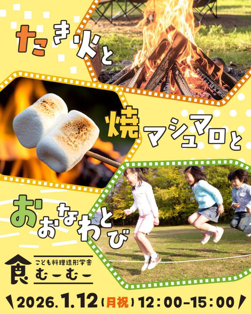 2025年12月のワークショップに続き、野外イベント第2弾開催致します。タイトルの通り、「たき火」「マショマロ」「おおなわとび」を楽しむ時間。