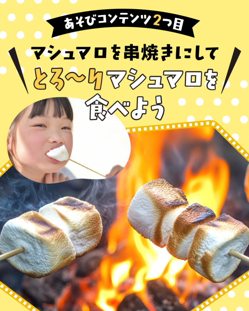 みんなで作った火に、串に刺したマショマロを投入すると、とろーり温かいおやつが完成!火を囲いながら焼きマショマロタイムを楽しみましょう。